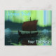 A slightly stylized image of a Viking longship sailing at night under the Northern Lights, there a couple of icebergs; most of the crew is asleep. French text reading, “Joyeux Noёl” appears in glowing blue and white.. Add your own additional text.
