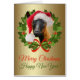 Belle peinture de cette Belle Chèvre Oberhasli - Elle porte un chapeau de Père Noël entouré d'une couronne de Noël festive sur un arrière - plan d'or qui peut facilement être enlevé pour révéler un arrière - plan blanc si vous le souhaitez - dans une scène de ferme de Noël entourée de la même couronne de Noël et personnalisable sentiment intérieur - Cartes de Noël de chèvre pour les amateurs de chèvre à envoyer comme une carte de Noël unique - par GetYerGoat.com