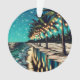Joli art côtier Ai romantique représentant une rangée de palmiers avec des lumières blanches illuminées. Une jolie réflexion sur la plage de sable et les vagues.