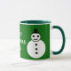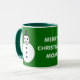 Cette tasse festive amusante ferait un grand cadeau pour maman. Il dispose d'un bonhomme de neige blanc et souriant de Noël avec des boutons noirs et un chapeau haut. Il a l'air d'un agent cool et aimerait vous aider à répandre la joie de Noël cette année. L'arrière - plan est un vert festif. L'image est des deux côtés de la tasse. Entre les est le message "Joyeux Noël maman, ce texte est personnalisable afin que vous pouvez transformer ceci en un joli cadeau personnalisé pour votre maman ou une autre relation ou ami. Le design est montré sur une tasse verte et blanche de style rond, mais est également disponible sur de nombreux autres styles et couleurs de tasse, y compris de belles tasses en verre dépoli et des tasses de voyage commode pour garder les boissons chaudes au chaud pendant l'hiver.