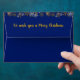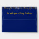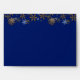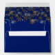 Enveloppe de carte de Noël en bleu foncé avec design de flocons d'or. Les flocons tombent du dessus avant et du rabat et le design se transporte sous le rabat. Une ligne de texte doré sur le rabat est facile à customiser. L'exemple de libellé est : "Nous vous souhaitons un joyeux Noël". Utilisez pour envoyer des cartes de Noël ou des invitations à des fêtes de Noël.