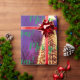 Joyeux Noël stylisée typographie verte avec brillant, à l'extérieur de l'arbre de Noël et beau arrière - plan de nuit, avec divers arbres, ciel bleu profond et lumière violet répétition design motif pour votre joie festive.