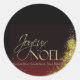Joueux Noel in gold script font against a dark background with twinkling Christmas tree. Great sticker for giftbags, envelopes, decorations and more.