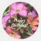 Une feuille d'autocollants floraux avec la photo d'une fleur murale vivace nommée "Constant Cheer" et Joyeux anniversaire en blanc au centre. Voir aussi boutons, badges et claviers avec le même design.