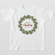 Ce T-shirt de Noël simple et élégant présente une belle couronne de feuilles verts, des baies rouges et des châtaignes brunes, des cônes de pin. De plus, une typographie verte et rouge avec différents styles qui dit "Joyeux Noël et Bonne Année" sur un arrière - plan blanc