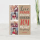 La coutume abordable a imprimé des cartes photos de vacances avec les modèles simples pour la personnalisation. Cette conception rustique moderne a un mélange de fête de la typographie en rouge, le blanc et le gris sur un arrière - plan de papier d'emballage de faux. Les mots indiquent l'amour, la paix, l'acclamation de vacances, la joie, et joyeux tout. Personnalisez-les avec 4 de vos photos le long du côté et ajoutez votre nom de famille et l'année. À l'intérieur de a l'espace pour les photos et le texte supplémentaires. Utilisez les outils de conception pour éditer le texte, ajoutez plus de photos et créez unique d'une conception de carte photo aimable de Noël.