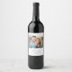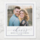 This wedding wine label design features a modern and elegant layout with a large, framed photograph occupying the upper section. The colour palette includes natural tones from the photo, complemented by a monochromatic text area in black script and print fonts on a white background. The typography highlights the word "cheers" in an elegant cursive font, followed by names and date in clean, uppercase letters. The mood is joyful and intimate, perfect for celebrating special moments like weddings or anniversaries.