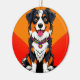 Charming illustration of a cheerful dog's face centred against a bold orange circle background, showcasing vibrant colours and a fun, cartoon style.