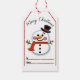 A festive Christmas tag showcases a friendly snowman adorned with a top hat and scarf. It exudes holiday cheer, perfect for gift wrapping during the joyous season.