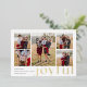 Share holiday greetings with these chic Christmas photo cards featuring five favourite photos in a collage layout (4 square and one portrait/vertical). "Joyful" appears along the bottom in modern gold foil lower case lettering, with your custom holiday greeting, family name, and the year aligned at the left. Cards reverse to a festive pine tree pattern.