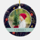 Festive photo Christmas ornament features a favourite photo on each side, framed by a holiday botanical pattern on a rich midnight blue background. Personalize with a custom caption on each side; shown with names in handwritten script and the year on the reverse. Coordinates with our Joyful Type holiday collection.