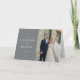 These wedding thank you cards feature a modern, balanced layout with a split design. The left side showcases elegant serif typography on a muted grey background, while the right side displays a candid photo of a couple in formal attire against a rustic stone backdrop. The colour palette includes soft greys, navy blue, and peach tones, creating a sophisticated yet warm aesthetic. Perfect for expressing gratitude after your special day, these cards blend timeless style with personal sentiment.