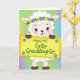 This card features a stylized lamb-like character with fluffy white fleece, rounded shapes, dark expressive eyes, rosy cheeks, and a small smile that feels like it’s meant for someone close. A floral crown of yellow and soft purple blossoms with green leaves rests on its head, adding a gentle, affectionate touch 🌷. Behind it, the background fades vertically from spring green into light lavender and then sky blue, creating a calm, airy setting. The character stands upright with tiny dark hooves showing and holds a bright yellow rectangular banner across its body, as if presenting it to a dear friend or loved one 🐰. The banner has a scalloped edge and a couple of small purple flower accents that echo the crown. Centered on the banner is a short holiday message in green lettering, placed to read clearly against the yellow, with the words filling most of the sign. Soft, even lighting keeps the fleece bright and the pastel gradient smooth, while the yellow banner stays the strongest color on the page. The scalloped border and the small purple blossoms sit along the banner’s edges, with the green text centered across the middle.