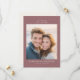 This wedding save the date features a modern and clean design with a central photograph of two individuals on a beach, framed by elegant maroon text blocks. The color palette combines warm tones from the photo with deep maroon accents, creating a rich yet inviting aesthetic. Bold sans-serif typography highlights key details, ensuring clarity and readability while maintaining a stylish look. The layout is balanced and centered, emphasizing simplicity and focus on the heartfelt moment captured in the image. Perfect for setting the tone for a joyous celebration, this design conveys warmth and anticipation.