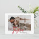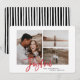 Joyful multi photo christmas card. Festive red script text with a modern edge. Hand painted striped backer. Change the packet colour to customize.