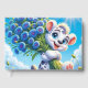 A cute, spotted puppy happily carries a large bouquet of vibrant blue cornflowers across a bright, sunny field. The clear blue sky and blooming wildflowers create a cheerful and whimsical scene, perfect for a heartwarming illustration.