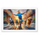 A young boy roller skates energetically down an urban street while happily walking four different dogs. The setting sun casts a vibrant glow over the scene.