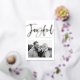 Modern foil holiday card featuring "Joyful" hand-lettered rose gold foil script with a white background. Personalize the front of the card by adding your favourite horizontal photo and name. The reverse side of the card features a black and white modern Christmas tree pattern.