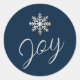 Enhance your holiday gifts and packages with a touch of elegance using this exquisite round sticker. The rich navy blue background features a brushed silver snowflake at the top, embodying the magic of the season. Below, the word "Joy" is artfully written in a charming font, capturing the essence of festive cheer and happiness. These stickers are the perfect addition to your holiday mailings, adding a special touch of warmth and joy to your greetings. Seal envelopes, embellish gift wrap, or adorn favour bags with this captivating design, spreading the spirit of celebration and delight. Elevate your holiday presentations with this enchanting and meaningful sticker.