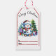 A charming snowman stands next to decorated trees and colourful gift boxes, holding a festive cup. The tag wishes everyone a Merry Christmas with a joyful design perfect for gift giving.
