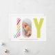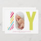 This design features the word JOY. The J is made of a colourful diagonal striped pattern, and the Y is a light green colour. The O will display your photo.