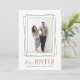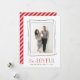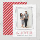 Modern holiday photo card features your favourite vertical photo framed by overlapping geometric borders in crisp black. "Be Joyful" appears beneath in a combination of handwritten script and block lettering in vibrant holiday red. Personalize with your family names and the year. Cards reverse to red and white diagonal stripes.