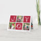 Share holiday greetings with these folded Christmas greeting cards featuring three of your favourite square photos in a horizontal gridded layout, alternating with "JOY" in festive white typography formed with Christmas botanicals and holiday flowers, against a red background. Add your custom greeting along the bottom, and personalize the inside with a pre-printed message and signature.
