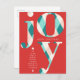 This bold and modern Christmas card design radiates festive energy with a striking red background and the word "JOY" in large, patterned typography. The accompanying text spreads heartfelt holiday wishes, making it a perfect choice for sharing the spirit of Christmas. With a mix of contemporary and classic elements, this card conveys a message of joy, peace, and cheer for the season.
