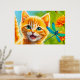 A cute orange tabby kitten frolicking in a flower garden with colourful dragonflies.