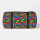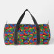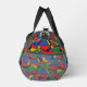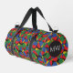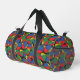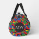 Colourful juggler juggling balls patterned duffel bag, with a monogram area at one end to add your own initials or text