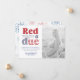 Patriotic Red White and Due (a play on "Red White and Blue") pregnancy announcement with a photo of the glowing mom to be or both proud parents. The front side features fun typography (in red white and blue of course) in a trendy retro 1970s inspired font. The reverse side is a print made from red white and blue watercolor firework illustrations.