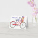 A fun red, white and blue bicycle with an adorable golden puppy in the basket!