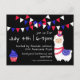 Cute llama in a red pom-pom and a blue and white star blanket in a top hat for a 4th of July celebration.