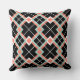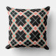 Throw pillow with a large diagonal plaid pattern in coral orange, mint green, black, and white.