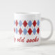 This 20 oz. (ounce) jumbo size mug has a "My Old Socks" saying written in dark red lettering and a customizable text field for a name. The design features a dark red and blue knitted argyle sock motif. A gift that is perfect for you or for any coffee drinker.