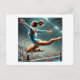 A female gymnast soars gracefully through the air, perfectly poised in a dynamic leap over the gymnastic bar. The packed stadium in the background highlights the energy and excitement of the competition.