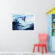 A beautiful blue marlin bursts through a wave in a spectacular jump.