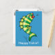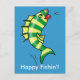 A green and yellow coloured jumping fish with a big red mouth, a fun drawing by Ans Collijn © Cool postcard to wish somebody Happy Fishin'!