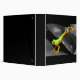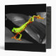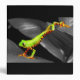 Acrobatic lime green tree frog with orange and black stripes on its belly, looks like he’s doing a handstand. Very colourful leaping amphibian on a black and white background.