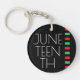 A Juneteenth celebration keychain. The keychain is red, black, and green with the background in black with white letters.
