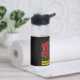 Water bottle featuring Social justice and Black History word art design with raised fists with "Juneteenth - the Real Independence Day" text in Pan Africa colours combo on black background.