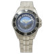 Has heft and feel of expensive stainless steel quartz watches. Good band with safety catch. I removed links, which is easy because engraved arrows show direction to push the linking pins. As always by this seller, the image (a railroad logo) is a perfect reproduction of my emailed image, and is precisely spaced and aligned.