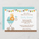 Adorable baby shower invite featuring a lion and giraffe sitting in a blue dot stroller with festive bunting on the top.