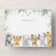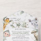 Invite friends and family in style and set the tone for your special day with this charming baby shower invitation. Design features jungle animals (giraffe, zebra, lion, elephant, cheetah, rhino) and eucalyptus leaves on white background.