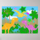 Jungle Dinosaurs Colour Poster. Cute cartoon dinosaurs: orange and pink T-Rex, blue Parasaurolophus and yellow flying Pteranodon in a pre-historic jungle landscape with palm trees and mountains with colour stars poster print. This dinosaurs poster print is fully customizable, add your texts and images. A great colourful kid's poster gift for the little big dino fan!