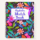 Sketch Book Jungle Flowers is a cute, bright, whimsy jungle flower design with pretty colours, flowers, leaves, and botanicals of all shapes and sizes with pops of colour on dark background with purple text and outline.