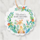 Cute jungle animals baby shower favour tag featuring a giraffe framed with jungle leaves.