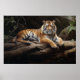 A magnificent tiger is depicted lying down in a lush jungle scene, its powerful