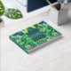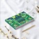 A beautiful watercolor seamless pattern featuring green and dark blue tinged with golden yellow monstera jungle leaves that has a faux shimmer dark teal green square inlay on which three templates for your custom wording appear. The spine is the same dark teal green and has another template on it for your title. All of the text templates are real foil too creating a timeless and elegant look to the cover.
