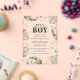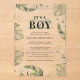 Wild, calm, and elegant boys safari animal baby shower invitation featuring a giraffe, gold effect and green leaves. Perfect for boys baby shower invitations